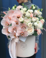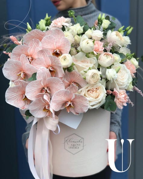 фаленопсис 2 шт, ранункулус 5 шт, эустома 3 шт, роза кустовая 7 шт.