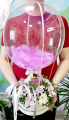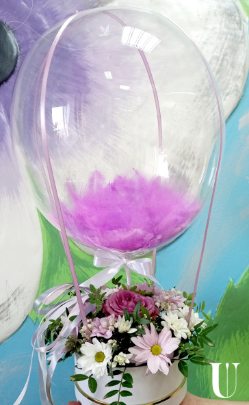 Хризантема кустовая 3 шт, гипсофила 1 шт, пистация 2 шт, роза 1 шт, шар сфера 1 шт, перья 1шт, коробка 1 шт.