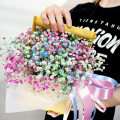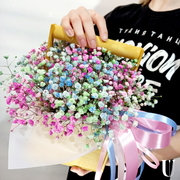 Гипсофила крашенная 3 шт, лента атласная 4 шт, оазис 1 шт, ящик деревянный 1 шт