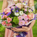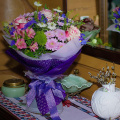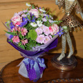 - Состав букета ( роза- 3; экзотика- 9; диантус- 3; хризантема- 3; статица- 11; ирисы- 3; ваксвауэр- 2; питоспорум-2; гвоздика зеленая- 3; эвкалипт-9