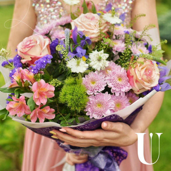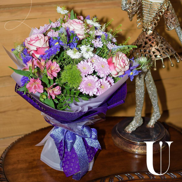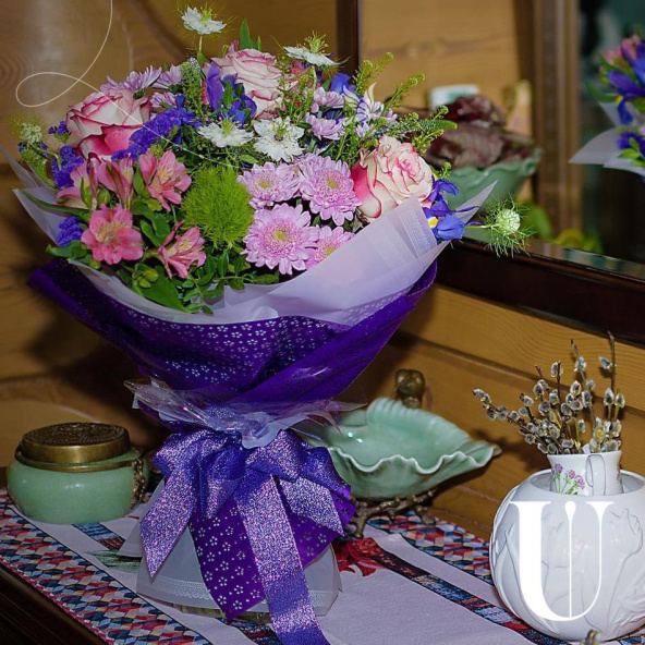 - Состав букета ( роза- 3; экзотика- 9; диантус- 3; хризантема- 3; статица- 11; ирисы- 3; ваксвауэр- 2; питоспорум-2; гвоздика зеленая- 3; эвкалипт-9