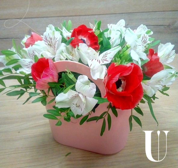 Анемоны 5 шт, альстормерия 7 шт, силиконовая сумка, оазис