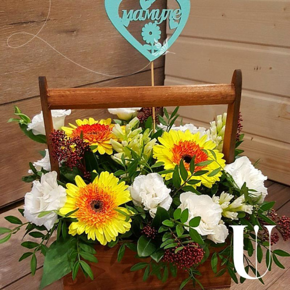 Гербера 3 шт, роза 7 шт, писташ 5 шт, альстормария 3 шт, ящик, оазис