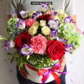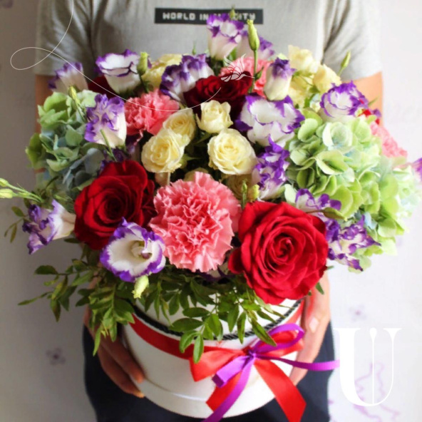 Гортензия 2 шт, роза 3 шт, гвоздика 3 шт, роза кустовая 1 шт, эустома 4 шт.