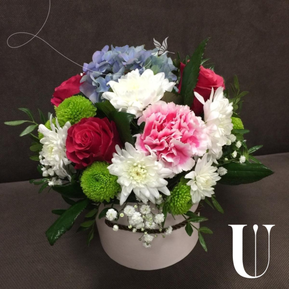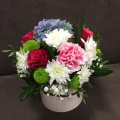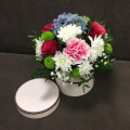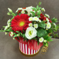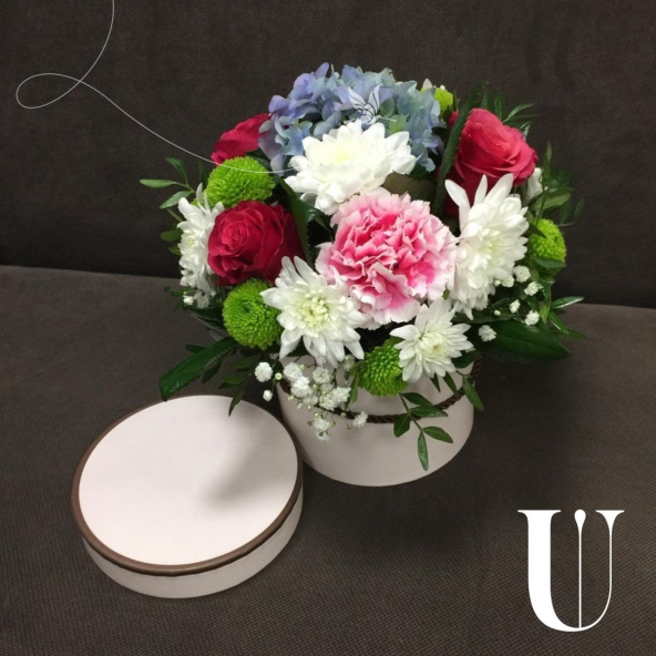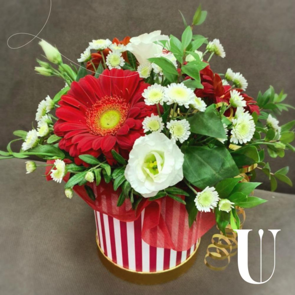 - (гербера -3 шт; эустома - 3 шт; хризантема -3шт; зелень)Оформление: шляпная коробка