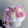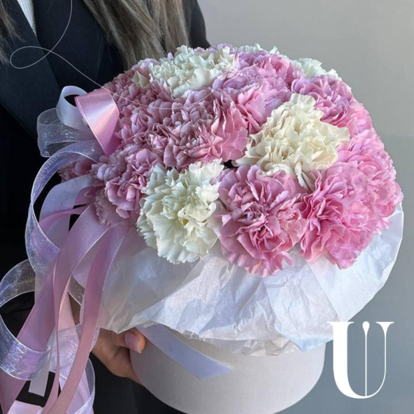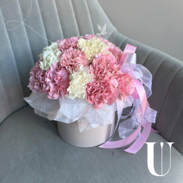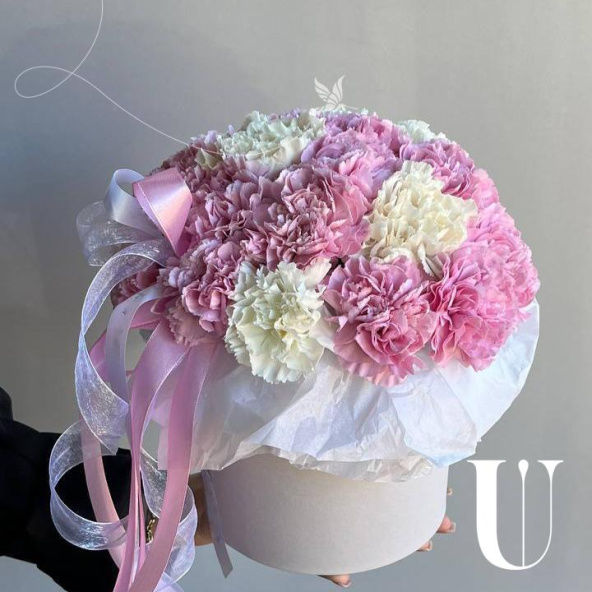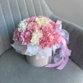 Букет в белом цвете из роз и диантусов в белой шляпной коробке
