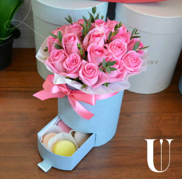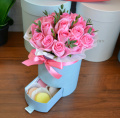 Букет в белом цвете из роз и диантусов в белой шляпной коробке
