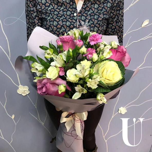 Роза 3 шт, гвоздика кустовая 1, брасика 1 шт, альстромерия 3 шт, роза куст 3 шт.