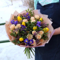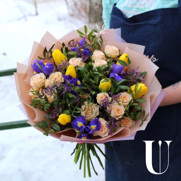 Тюльпан 6 шт, ирис 5 шт, роза кустовая 3 шт, лимониум 1 шт, зелень.