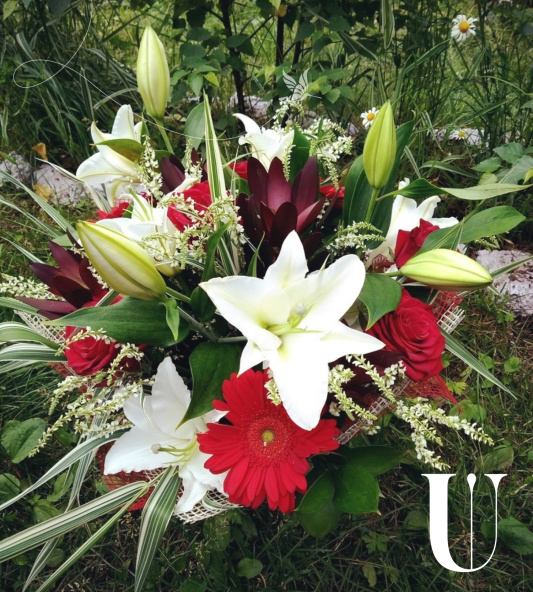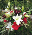 Лилии 3 шт. герберы 5 шт, леукадендрон 3 шт, роза 5 шт, зелень , оформление