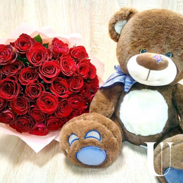 Роза 55 шт, оформление фетр, лента, мишка плюшевый 35 см