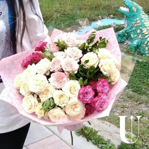 Роза кустовая пионовидная 9 шт, зелень писташ 5 шт, оформление пленка , лента