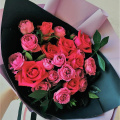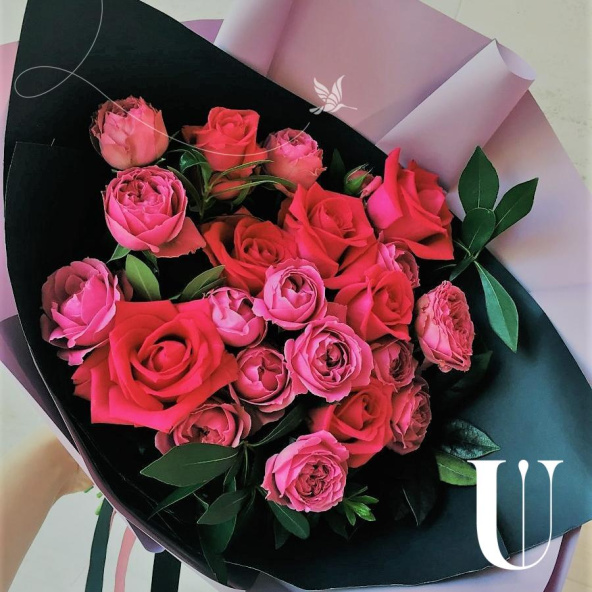 Розы 7 шт. роза кустовая 5 шт, рускус 7 шт, оформление пленка 2 шт, лента 2 шт