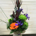 - Леукадендрон-3; ирис -5; хризантема одноголовая -3; лимониум- 3; берграс - пучок; зелень