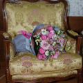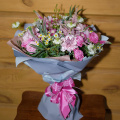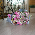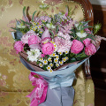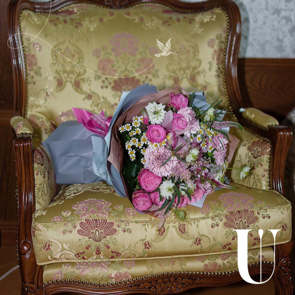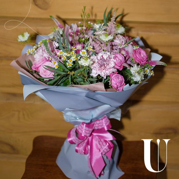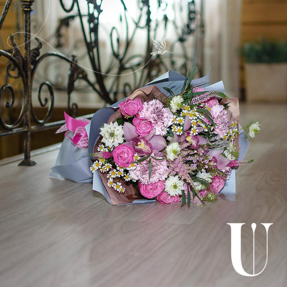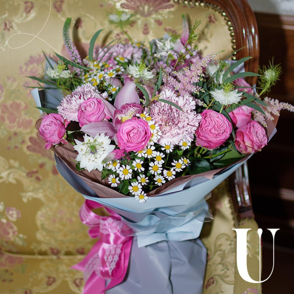 - Состав букета (орхидея- 3; роза кустовая- 4; диантус- 4; вероника- 3; ромашки- 3; астильба- 2; ваксвауэр- 5; бруния- 7; нигелла- 3; эвкалипт- 4)