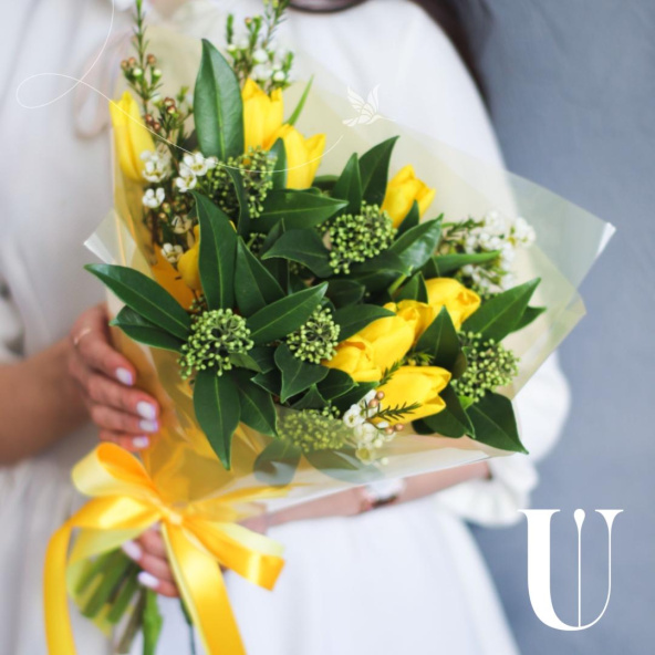 Тюльпан 9 шт, скимия 3 шт, хамелациум 2 шт
