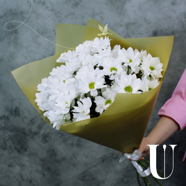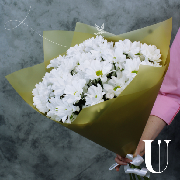 Букет из 5 белых кустовых ромашковых хризантем в матовой пленке с атласной лентой — это отличный выбор для тех, кто хочет подарить радость и тепло близким людям.