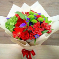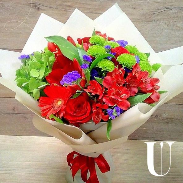 Гербера, альстормерия 5 шт, амариллис 1шт, статица 3 шт, хризантема 3 шт, пленка, лента