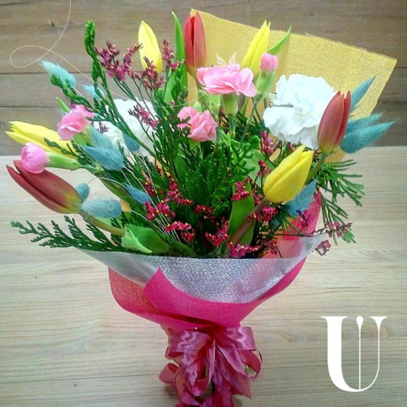 Тюльпаны 7 шт, лимониум 3 шт, диантусы кустовые 3 шт, туя 3 ветки , фетор лента