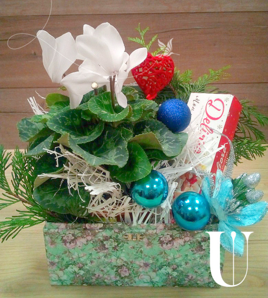 Цикламен, конфеты, декор , сундук , ель